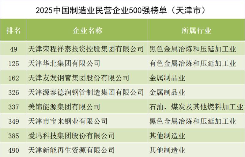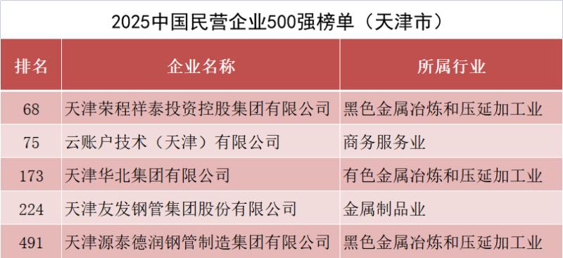 天津市5家民营企业入围“2025中国民营企业500强”;8家企业入围“2025中国制造业民营企业500强”;1家企业入围“2025中国服务业民营企业100强”。市工商联主席、总商会会长娄杰带队参加全程活动。市工商联副主席、天津友发钢管集团股份有限公司董事长李茂津,市工商联副主席、云账户技术(天津)有限公司董事长杨晖,市工商联副主席、天津华北集团有限公司董事长周文起,天津荣程祥泰投资控股集团有限公司副总裁高玉科,天津源泰德润钢管制造集团有限公司副总经理张延飞出席活动。荣程集团、云账户、友发集团作为企业代表上台领取证书。