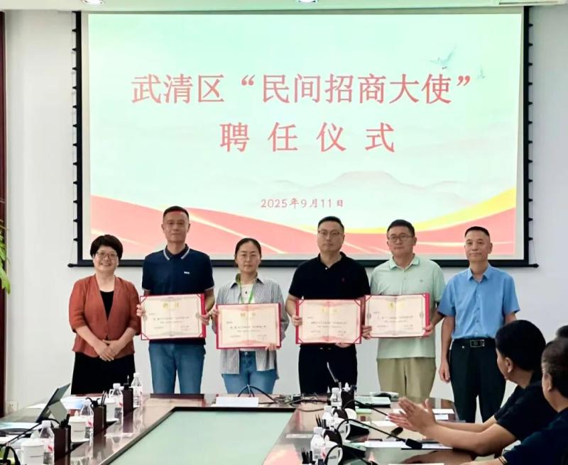 座谈会上,京清汽车产业园相关负责同志介绍了园区发展情况及京津冀智能网联新能源汽车科技生态港(武清)建设情况,宣传推介园区投资环境。红梅主席、永胜书记共同为新聘任的4位“民间招商大使”颁发聘书。