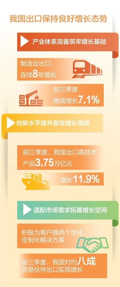 | 制图:张芳曼 10月13日,国务院新闻办举行新闻发布会,介绍前三季度进出口情况。据海关统计,今年前三季度,我国货物贸易进出口33.61万亿元,同比增长4%。其中,出口19.95万亿元,增长7.1%;进口13.66万亿元,下降0.2%。9月,进出口4.04万亿元,增长8%。海关总署副署长王军说:“我国货物贸易顶住压力,实现平稳增长,展现出较强韧性,有底气、有朝气、有锐气。” 有进出口实绩的外贸经营主体首次达70万家,超去年全年总量 “今年以来,我国外贸在复杂的外部环境下顶压前行,延续稳中向好发展势头。各地各部门攻坚克难、努力拼搏,广大外贸企业积极应变、开拓创新,我国外贸韧性彰显、结构优化,实现了量质齐升,成绩来之不易。”王军介绍。 进出口增速逐季加快。一、二季度我国进出口分别增长1.3%和4.5%,三季度增长6%,已连续8个季度实现同比增长。 市场多元化持续推进。前三季度,我国对共建“一带一路”国家进出口17.37万亿元,增长6.2%,占进出口总值的51.7%,比重提升了1.1个百分点。对东盟、拉美、非洲、中亚等进出口分别增长9.6%、3.9%、19.5%和16.7%。对亚太经合组织其他经济体进出口增长2%。 出口产品向新向优。前三季度,我国出口机电产品12.07万亿元,增长9.6%,占出口总值的60.5%,提升1.4个百分点。其中,出口电子信息、高端装备、仪器仪表等高技术产品分别增长8.1%、22.4%和15.2%;铁道电力机车等绿色产品增速达到两位数。 进口运行逐步回升。随着内需潜力有效释放,二季度进口同比增长0.3%,三季度增速进一步加快到4.7%。三季度,原油、金属矿砂进口量同比分别增加4.9%和10.1%;计量检测仪器、计算机及通信设备进口值分别增长9.3%和8.9%。 外贸主体积极活跃。前三季度,我国有进出口实绩的外贸经营主体数量首次达70万家,超去年全年总量,同比增加5.2万家。其中,民营企业61.3万家,进出口19.16万亿元,增长7.8%;外商投资企业8万家,进出口9.82万亿元,增长3.1%。 “有底气,主要体现在外贸大盘稳。”王军分析,前7月,我国进出口占全球货物贸易总值的比重为11.8%,继续保持全球货物贸易第一大国地位。有朝气,主要体现在增长动能新。前三季度,我国出口工业机器人增长54.9%。风电出海跑出加速度,出口风力发电机组及零件增长23.9%。有锐气,主要体现在外贸主体迎难而上、锐意进取。中国海关贸易景气调查最新结果显示,出口企业信心指数连续5个月回升,进口企业也连续3个月在回升。前7月,我国是166个国家和地区的前三大贸易伙伴,较去年同期增加了14个。 对约八成贸易伙伴出口实现增长 前三季度,我国出口保持良好增长态势,王军分析了几方面原因。 产业体系完备筑牢增长基础。我国工业制品出口份额自2008年起就稳居全球首位,近年来占比均接近两成。我国制造业出口已连续8年增长,前三季度继续增长7.1%。 创新水平提升激发增长潜能。前三季度,我国出口高技术产品3.75万亿元,增长11.9%,对同期整体出口增长贡献率超三成。 适配市场需求拓展增长空间。越来越多企业紧跟国际市场需求变化,积极为客户提供个性化、定制化解决方案。前三季度,我国对约八成贸易伙伴出口实现增长。 “我国是维护全球产供链稳定畅通的重要力量,国内存量和增量政策持续发力显效,广大外贸企业继续以高质量供给适配国际市场需求,都将为我国出口不断注入新动能。”王军表示。 前三季度,进口13.66万亿元,下降0.2%,但在逐步回升。“前三季度,国际市场部分大宗商品价格下跌,对进口增速和数据表现造成一定影响,但从数量来看,我国进口数量指数同比增加0.6%。前三季度外商投资企业进口增长1.1%。”海关总署新闻发言人、统计分析司司长吕大良说。 吕大良表示,看中国的进口,不仅要看市场规模,更要看中国主动扩大进口的大国担当。中国开放的大门越开越大,与越来越多的贸易伙伴分享中国式现代化的发展机遇。前三季度,我国新增135种农食产品准入,涉及50个国家和地区。对同我国建交的最不发达国家实施100%税目产品零关税,自这些国家的进口增长9.7%。同时,我国正积极推进通过商签共同发展经济伙伴关系协定,落实对53个非洲建交国实施100%税目产品零关税举措。 跨境电商进出口约2.06万亿元 前三季度,我国跨境电商进出口约2.06万亿元,增长6.4%。其中,出口约1.63万亿元,增长6.6%;进口约4255.4亿元,增长5.9%。 跨境电商作为贸易新业态,极大便利了国内外消费者。出口方面主要是服饰鞋包及珠宝配饰、数码产品及配件、家用办公电器及配件;进口方面主要是美妆及洗护用品、食品生鲜、医药保健品及医疗器具。我国“跨境电商+产业带”发展成效明显,主要消费市场与进口目的地高度相关,出口货物主要来自广东、浙江、福建、江苏和河南,进口目的地主要集中在广东、江苏、浙江、上海和山东。 海关不断深化改革,出台系列创新措施,助力跨境电商高质量发展。包括开展“先查验后装运”试点,推广跨境电商零售出口跨关区退货,简化企业出口申报手续,积极支持“跨境电商+中欧班列”等物流模式创新。优化税款支付模式,推出税款电子支付,跨境电商企业可以通过新一代税费电子支付系统在线完成缴税等。 近年来,我国西部地区坚持以大开放促进大开发,逐渐从内陆腹地走向开放前沿。2024年西部地区进出口首次突破4万亿元,占我国进出口总值比重达9.2%。今年前三季度,西部地区外贸发
