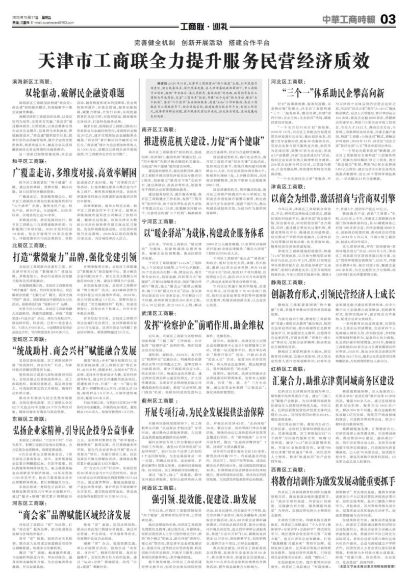 | 编者按:2025年以来,天津市工商联紧扣“两个健康”主题,扛牢思想引领责任,健全服务体系,深化改革发展。在天津市委统战部带领下,市工商联守正创新,按照“市里搭台、各区亮特色、基层出彩”的思路,统筹指导各区工商联与所属商会,完善“三驾马车”机制,开展“四个走进”助力活动,健全“五个机制”,落实“六个清单”企业联络服务,构建“3456”工作新格局。各区工商联在市工商联指导下,结合区域实际,搭建政商企校合作平台,创新工作形式,统筹资源解决问题,提升服务民营经济质效,形成各具特色、竞相发展的良好局面。 滨海新区工商联: 双轮驱动,破解民企融资难题 滨海新区工商联创新构建“商会贷+商会通”双轮驱动模式,有效破解中小微企业融资难题。 该模式依托工商联组织优势,以商会信用为纽带,实现多方共赢。“商会贷”通过整体授信、分部放款,以商会整体信用为会员企业增信,显著简化审批流程,降低融资成本。“商会通”提供按日计息、按季付息的灵活融资服务,提升企业资金使用效率。两者形成互补,覆盖企业从获得融资到优化资金管理的全链条需求。 这一创新已取得显著成效。在企业层面,融资难度和成本明显降低,资金周转效率提升。在商会层面,服务功能拓展,凝聚力增强。在银行层面,实现批量获客和风险可控。在政府层面,精准服务实体经济,打造特色服务品牌。 截至目前,滨海新区工商联已推动21家商协会与金融机构签约,持续授信金额近20亿元,逐步实现商协会金融服务全覆盖。“商会贷”累计解决信用融资近10亿元,“商会通”预计为企业增加财务收入近1000万元。该模式已获得天津市委统战部、市工商联肯定并在全市推广。 和平区工商联: 广覆盖走访,多维度对接,高效率解困 和平区工商联紧扣“两个健康”主题,通过走访调研、资源对接、解决问题,助力民营经济提质增效。 广覆盖走访,靠前服务暖企心。和平区工商联结合常态化联系服务机制与“六个清单”机制,聚焦支柱产业、特色产业、新兴产业,主动服务。2025年以来,实地走访企业50余家。 多维度对接,助企发展向优行。和平区工商联从三方面搭建服务桥梁:与职能部门专项对接,2025年组织活动10余场,校企对接吸引94家企业参与,开展政策培训与民法典培训。依托街道商会扩面对接,借“百律联百企”等活动,让服务触达更多小微企业与个体工商户。聚焦需求精准对接,协助天津馐参堂科技公司推进职业技能培训项目申报等。 高效率解困,服务大局见实效。和平区工商联仅用半个工作日,就帮天津陇福康农业科技公司解决了执照问题。赋能长远发展,协助天津京大物流公司办社保转移并建立就业见习基地。优化环境激发新动能,以优质环境吸引企业落地,2025年以商招商落地32家企业,为区域经济注入活力。 北辰区工商联: 打造“紫微聚力”品牌,强化党建引领 北辰区工商联联合区委社工部,在天津市率先打造“紫微聚力”党建品牌,多维度发力,推动行业商协会党建与服务会员深度融合。 在强基铸魂方面,北辰区工商联推进“两个覆盖”攻坚,培训党支部书记。北仓镇商会创建“七联七动”模式,获评全国“四好”商会。双街镇商会开展思政大讨论活动,辰联商会打造“辰联HUI”品牌。 在多方用力方面,北辰区工商联构建大思政格局,搭建党建联盟,开展“党建思政+行业沙龙”活动。深化与高校合作,建设研究院、科技园,已有71家企业入驻,引进人才600余人。小淀镇商会促进企业就近合作,节约物流成本2000多万元。 在精准服务方面,北辰区工商联建立“紫微聚力”商会服务中心,累计解决企业问题30余个。助力江天大数据公司盘活800亩土地,建设京津算力产业园。 在创新发展方面,北辰区工商联开展“岗位练兵”活动。双口镇商会助力中投科技公司拓展海外市场,2024年,该公司营业额达1.7亿元。昊野科技公司通过“党员揭榜挂帅”机制,加速成果转化,研发出水下机器人,并在北京冬奥会亮相。 在责任担当方面,北辰区工商联引导企业履行社会责任。宜兴埠镇商会设立50万元基金。区青年商会与西藏丁青县结对帮扶,捐资捐物超过24万元。 宝坻区工商联: “统战助村、商会兴村”赋能融合发展 宝坻区委统战部、区工商联创新开展“统战助村、商会兴村”行动,为乡村振兴贡献民营经济力量。 坚持高站位谋划与高标准推进相结合。宝坻区建立区委统战部牵头、区工商联组织、街镇党委推进、基层商会发力、村党组织落实的工作格局,确保行动有序开展。 推动乡村需求与民企优势有效链接。宝坻区委统战部、区工商联从全区82个欠发达村中选取24个作为帮扶对象,精准对接乡村需求与商会资源。 激发“商会+乡村”融合发展活力。宝坻区委统战部、区工商联打造“智汇乡村、业兴乡村、情暖乡村、文润乡村”四大品牌。支持乡村旅游设计大赛,支持科研成果转化。通过村企共建提供就业岗位,搭建电商平台。开展“一老一小”暖心捐赠,累计捐赠物资5.5万元。组织义诊24场,服务群众1.4万余人。开展非遗传承活动,覆盖500余人次。 行动开展以来,宝坻区已实现24个帮扶村活动全覆盖,开展活动36场次,惠及群众1900余人,发放宣传资料1.2万份。 东丽区工商联: 弘扬企业家精神,引导民企投身公益事业 东丽区工商联以“万企兴万村”行动为抓手,积极引导民企投身公益事