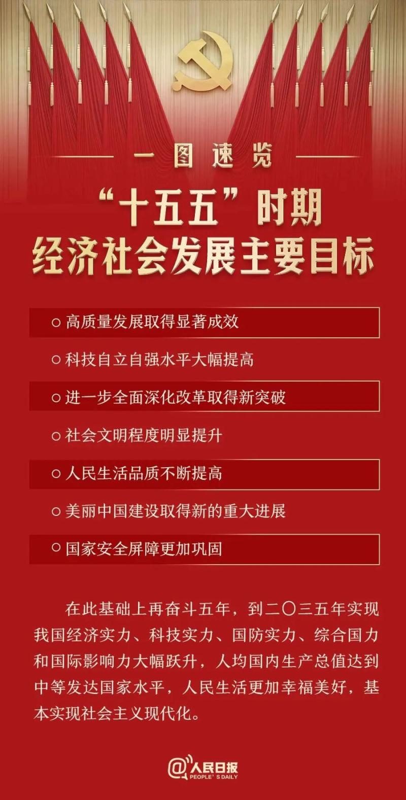 “十五五”时期经济社会发展的主要目标:高质量发展取得显著成效,科技自立自强水平大幅提高,进一步全面深化改革取得新突破,社会文明程度明显提升,人民生活品质不断提高,美丽中国建设取得新的重大进展,国家安全屏障更加巩固。在此基础上再奋斗五年,到二〇三五年实现我国经济实力、科技实力、国防实力、综合国力和国际影响力大幅跃升,人均国内生产总值达到中等发达国家水平,人民生活更加幸福美好,基本实现社会主义现代化。