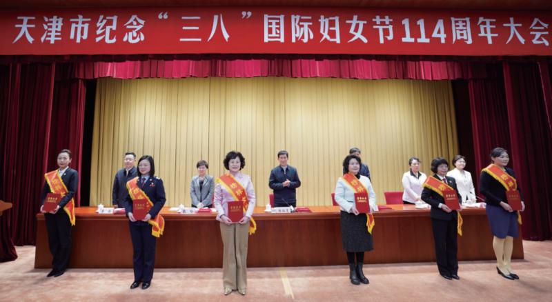 天津市静海区女企业家商会荣获“全国三八红旗集体”称号,赵俊荣(前排左三)代表商会在天津市纪念“三八” 国际妇女节114周年大会上接受表彰。
